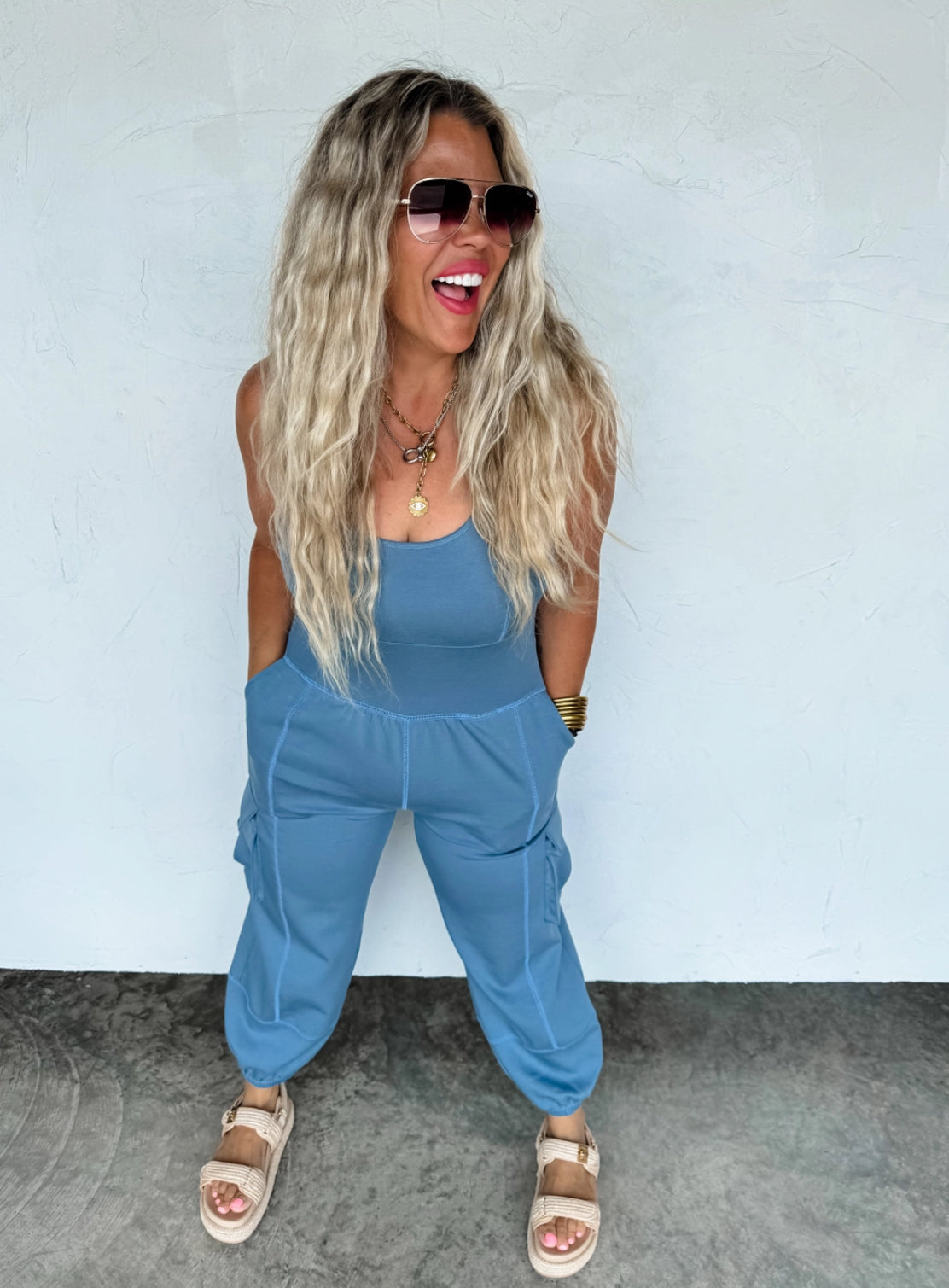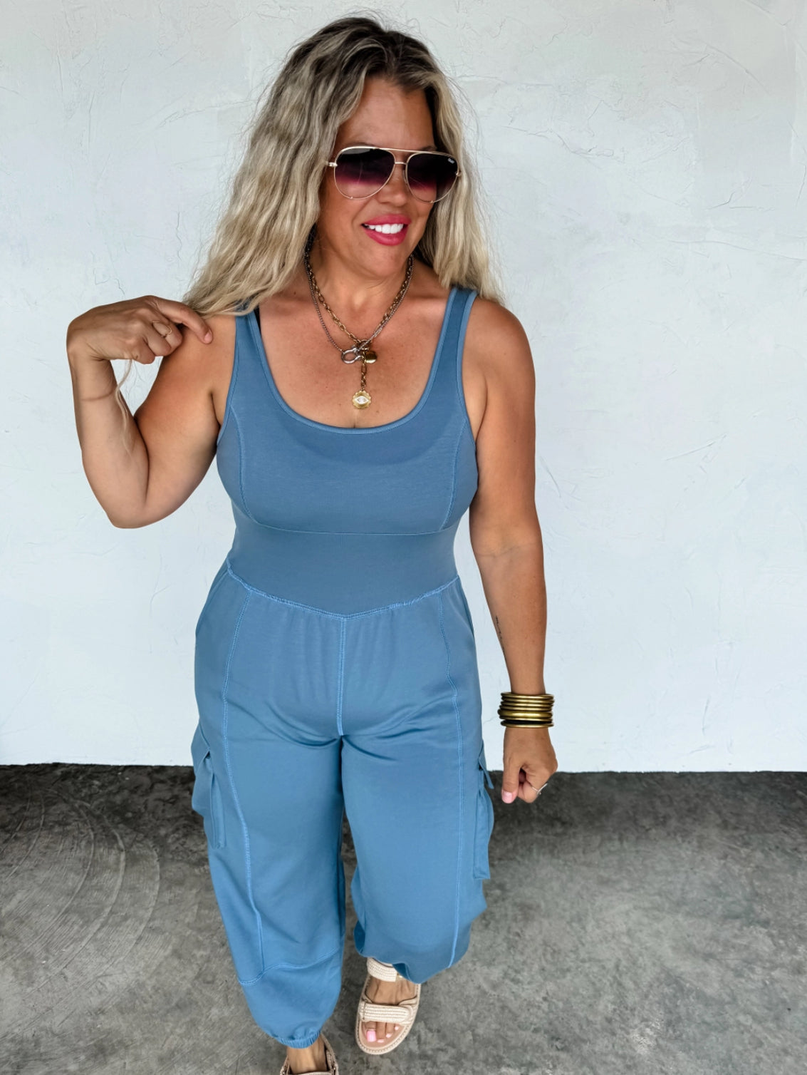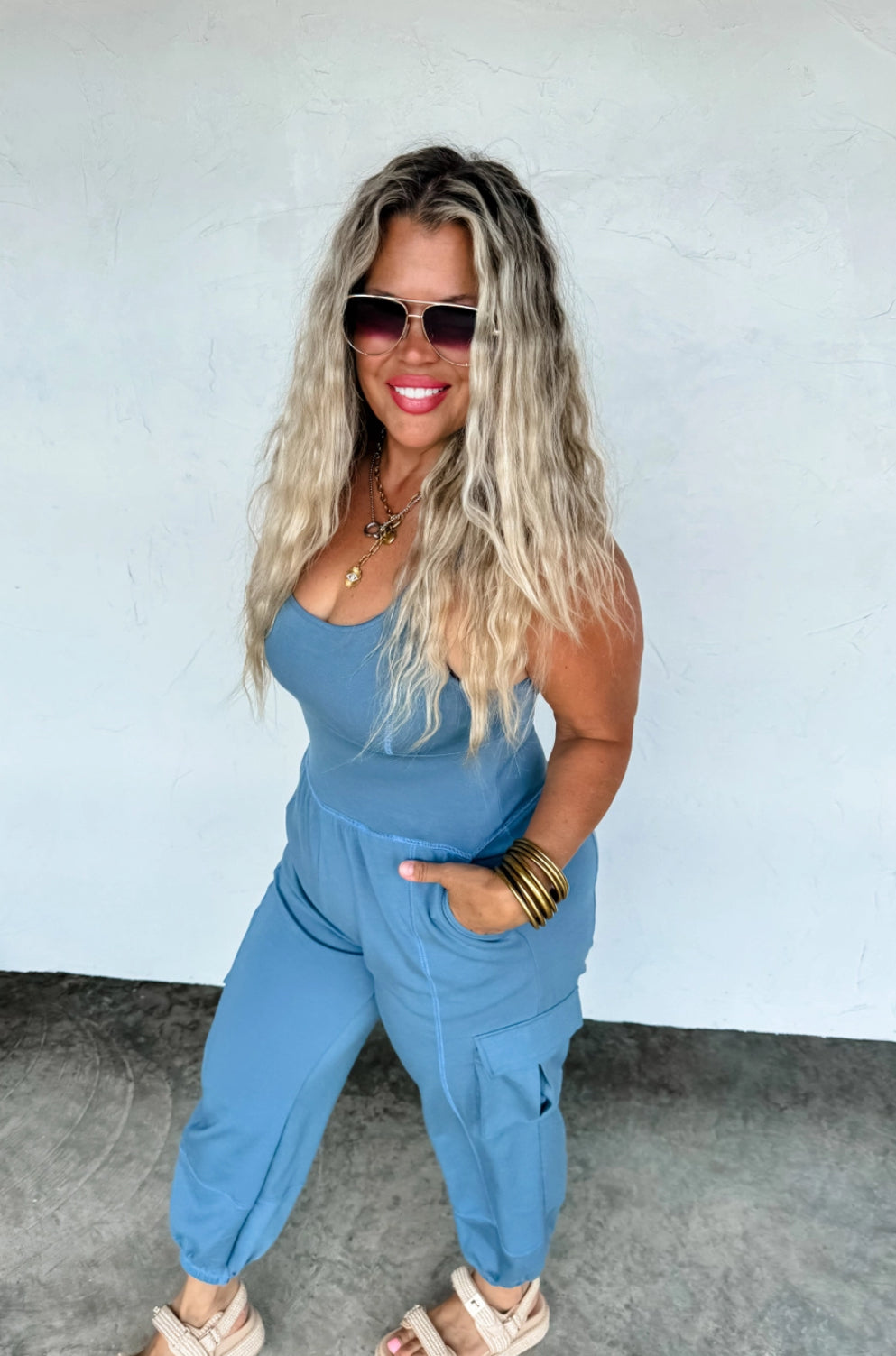Made from soft, breathable fabric with the perfect amount of stretch, this tank-style romper features a flattering scoop neckline, side pockets, and utility-style cargo pockets.
