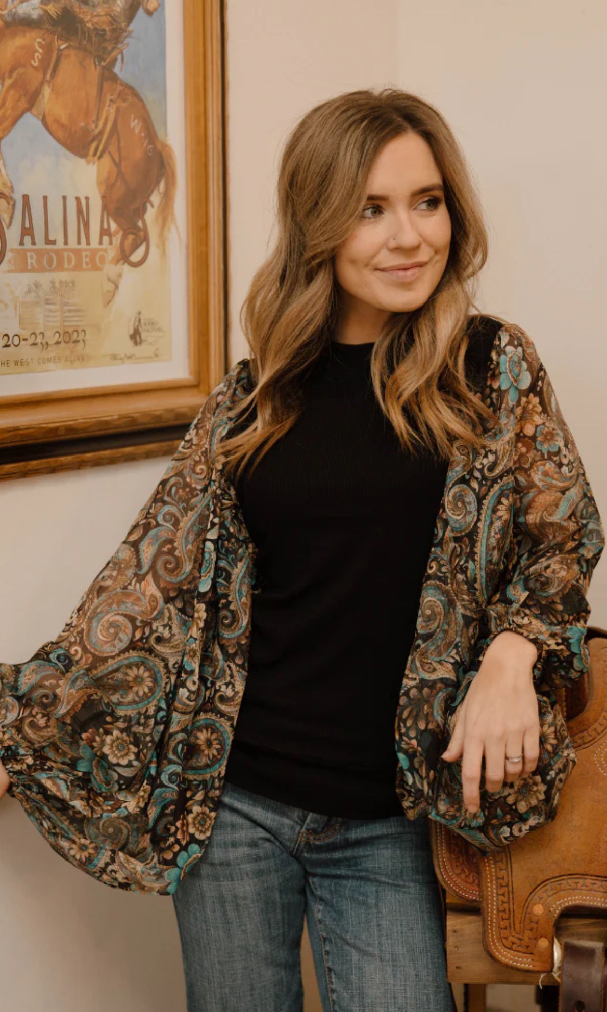 Elevate your style with the Paisley Dreams Top, featuring a sleek black fitted silhouette enhanced by voluminous bubble mesh sleeves. The sleeves showcase a subtle paisley pattern in neutral tones, adding a touch of elegance and intrigue. This top effortlessly combines comfort with standout design, perfect for making a sophisticated statement at any occasion.