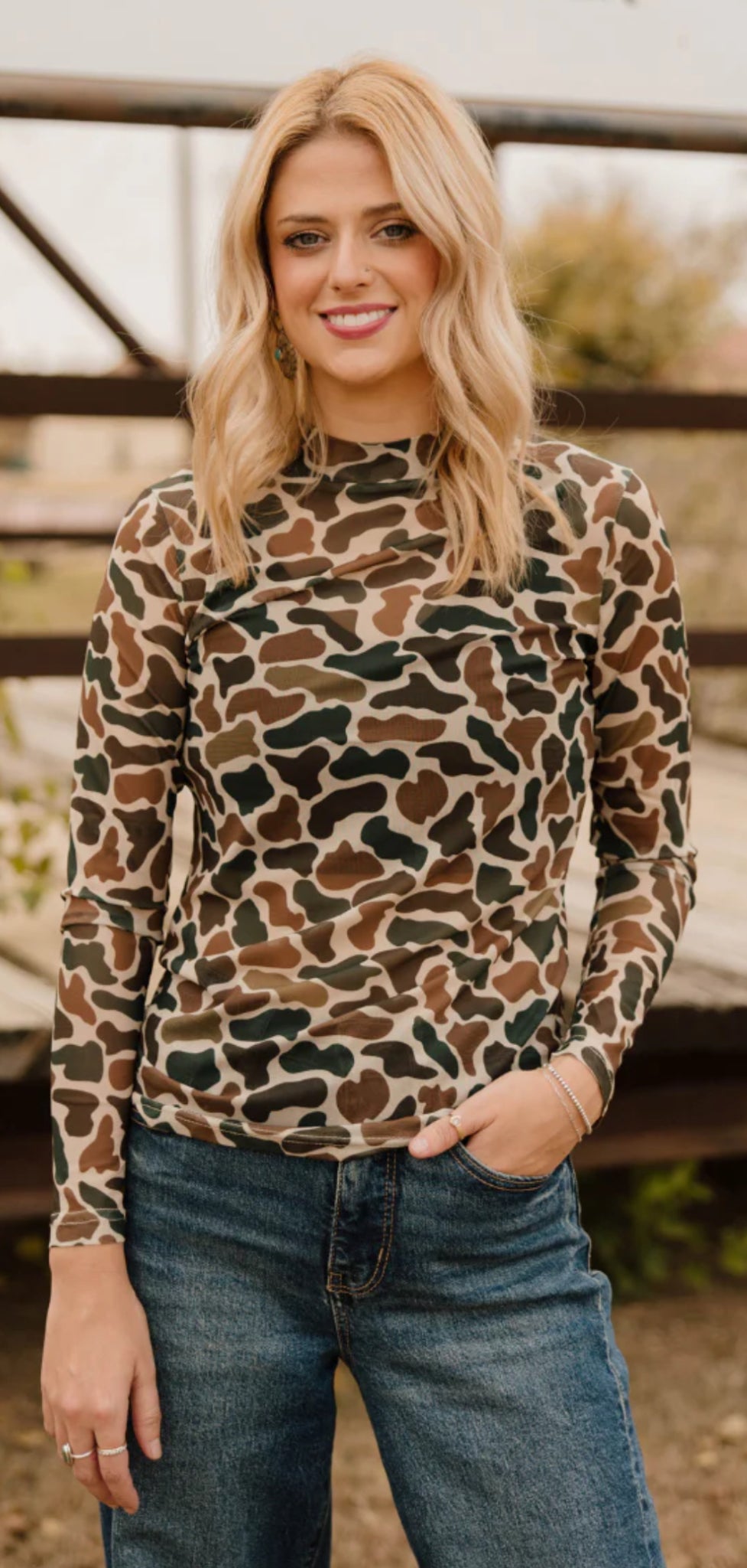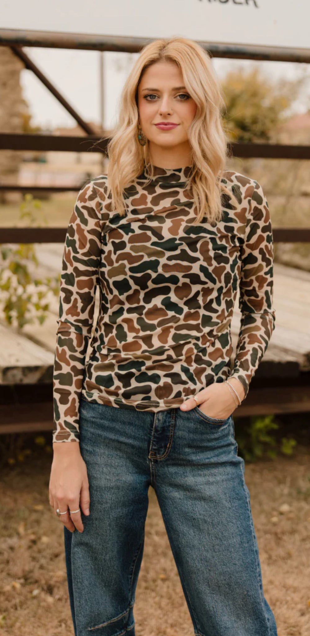 Unleash your daring side with the You Can't See Me Mesh Top! Featuring a trendy camo print and breathable mesh fabric, this top adds edge and style to any outfit. Perfect for those who aren't afraid to stand out and make a statement.